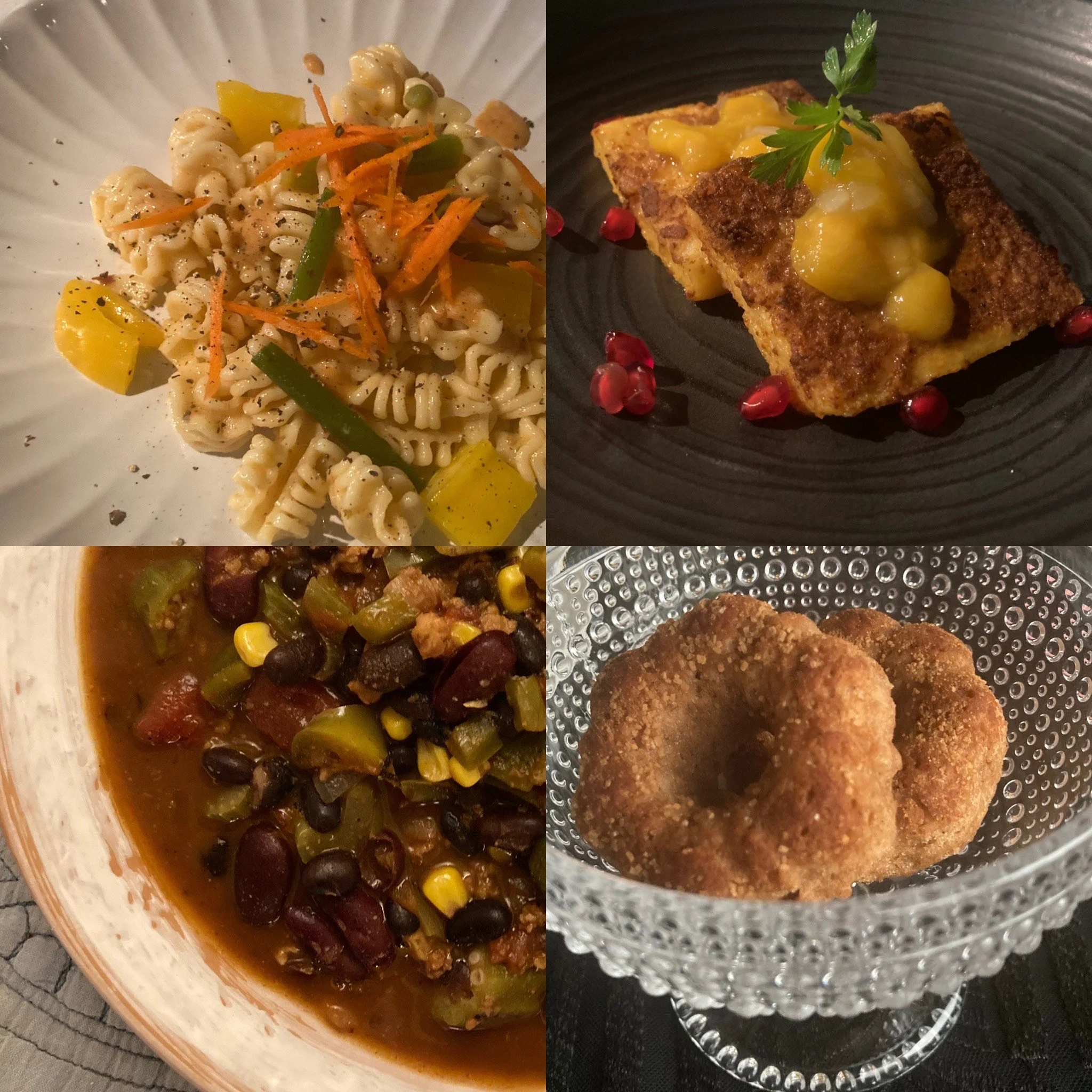 10/22: organic hot-orange glazed & grilled polenta with mangoes + radiatori pasta salad + organic fresh vegetables & two-bean slow-pot chili + autumn mini bundt cake.