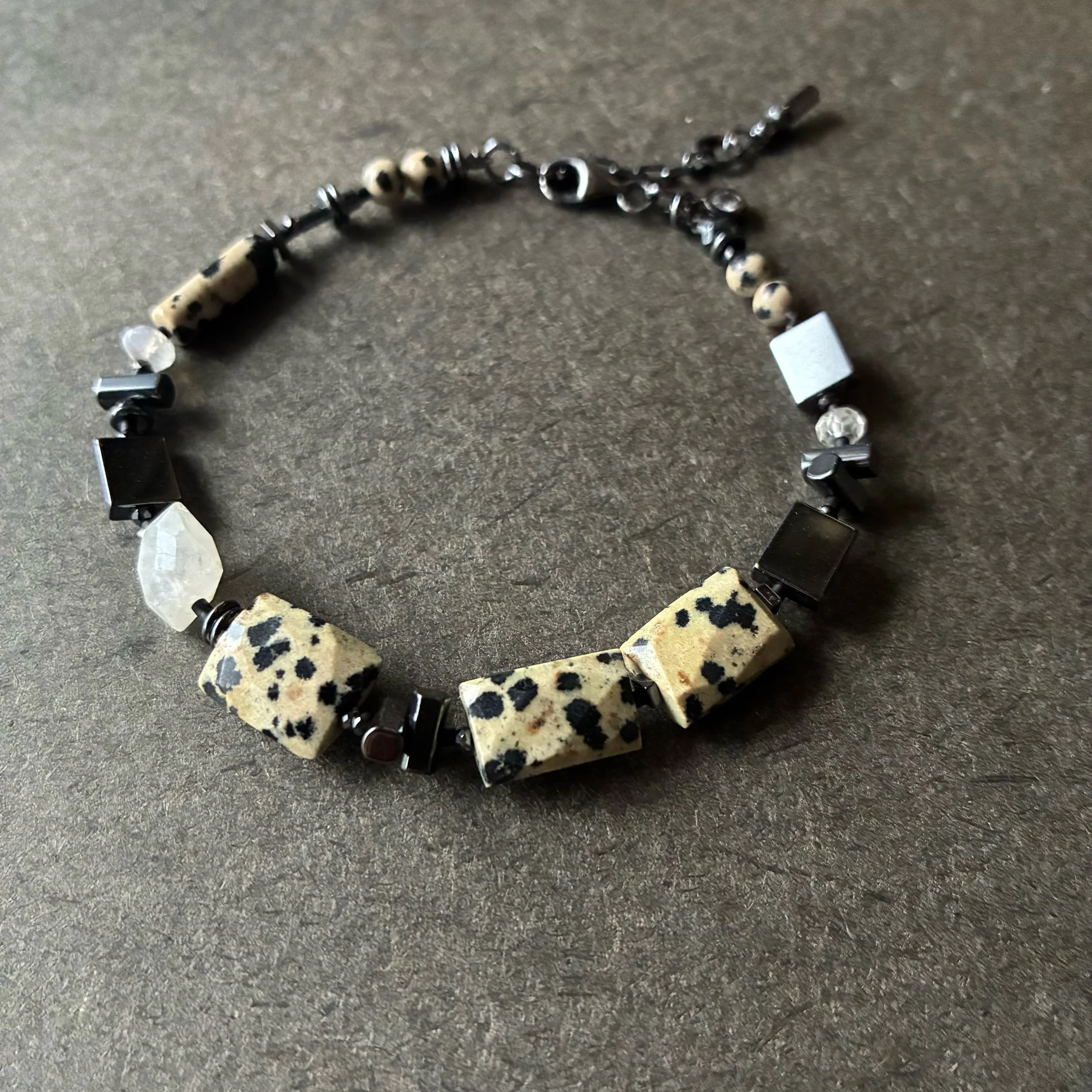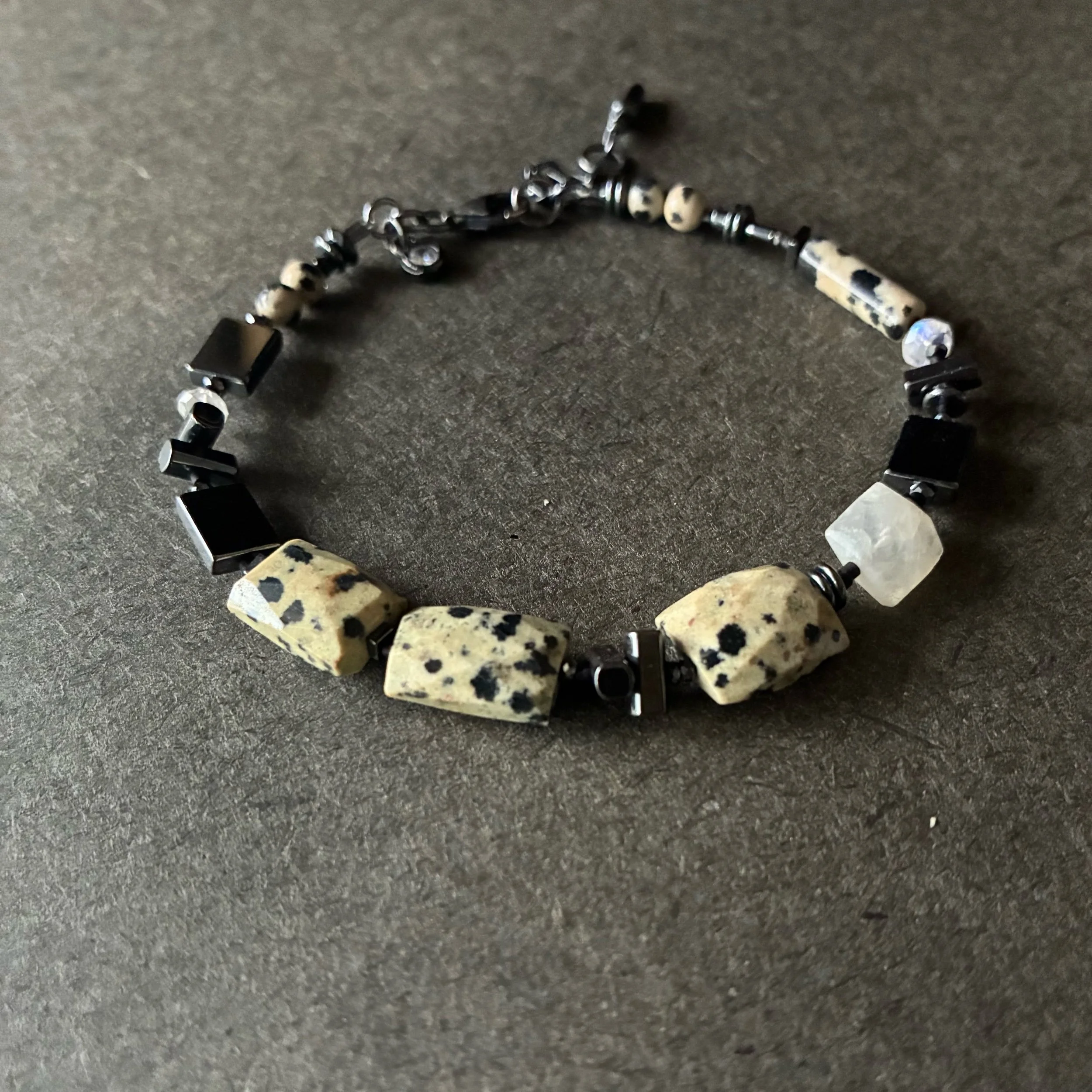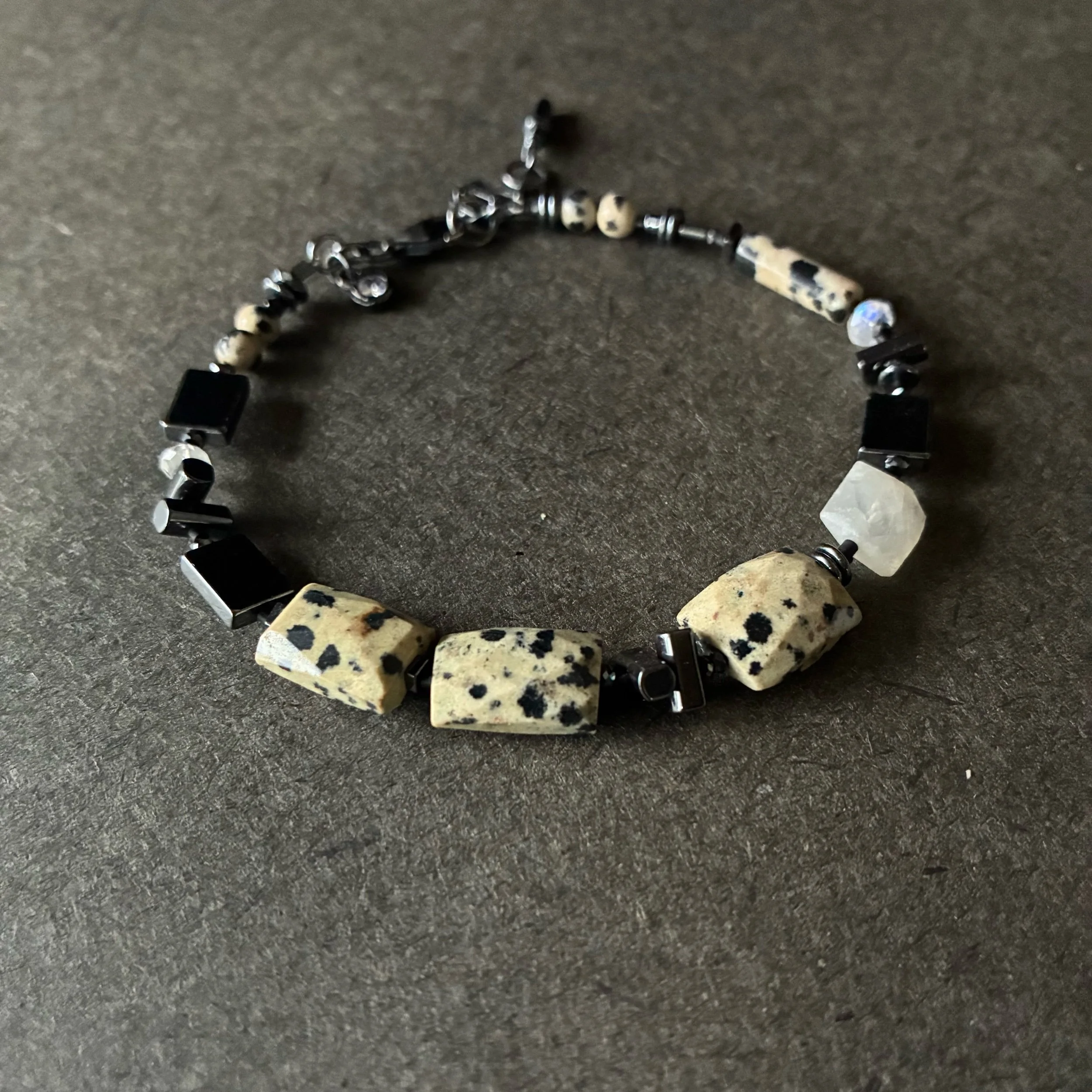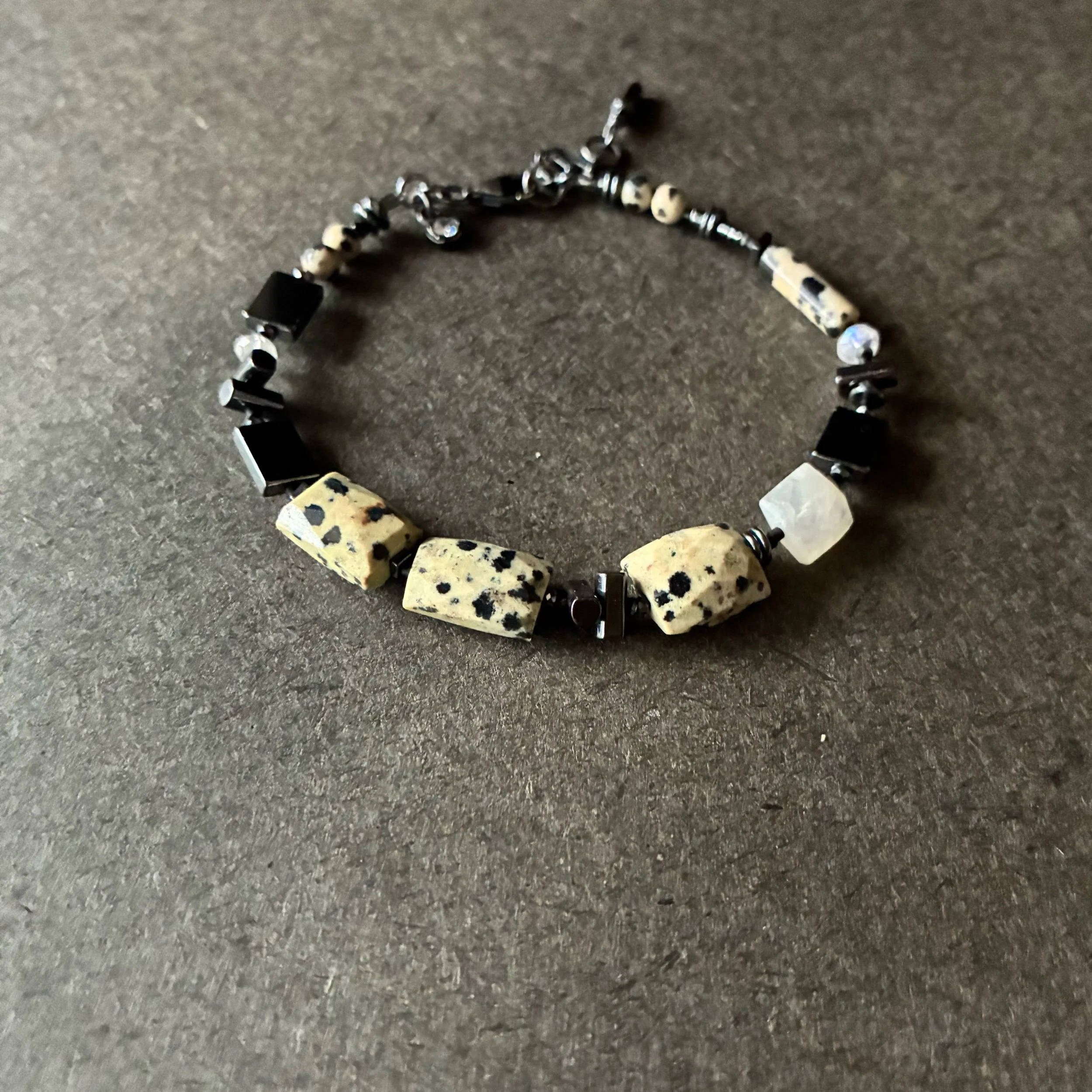 This bracelet is made of faceted rectangle shaped Dalmatian Jasper, faceted Moonstone and various shaped Hematite