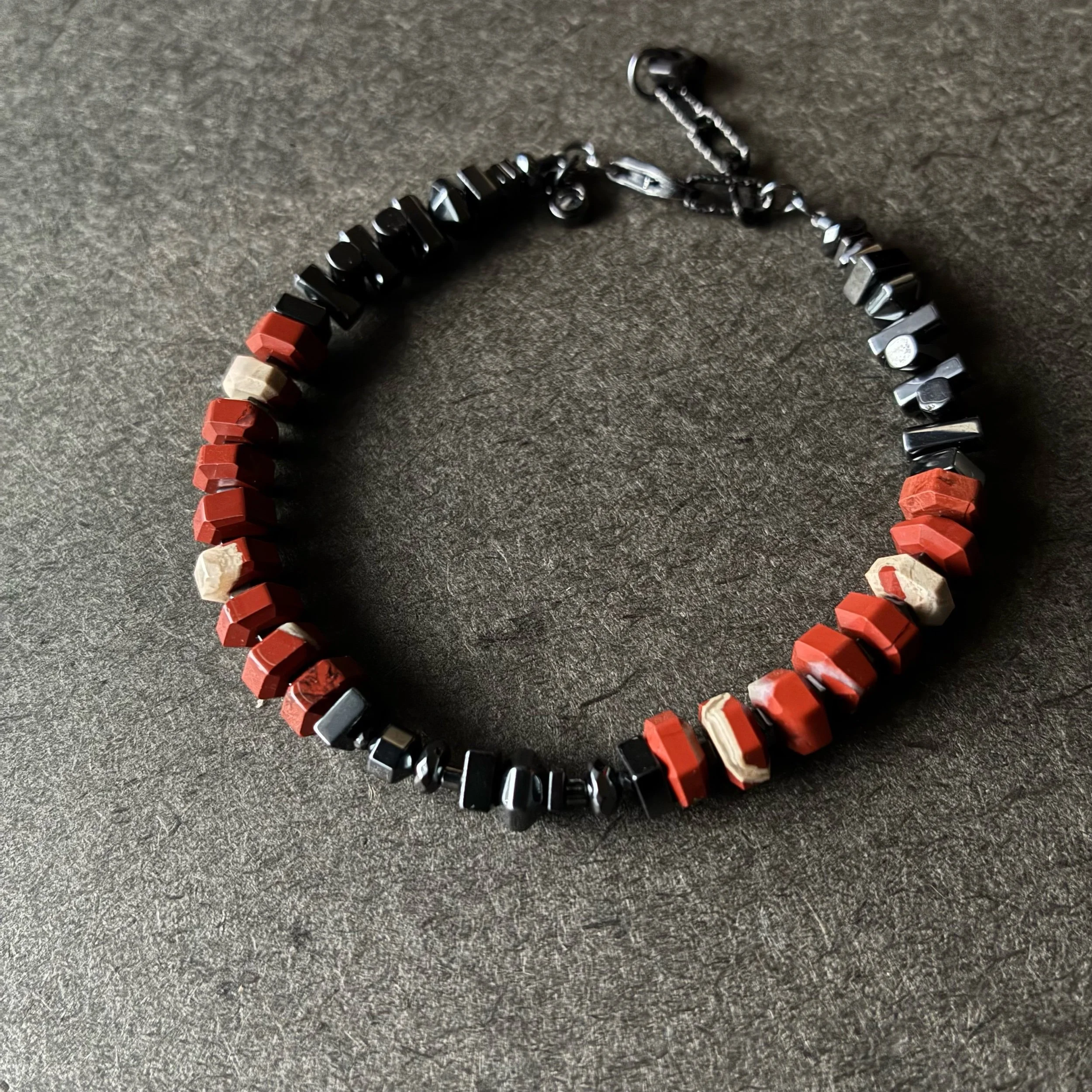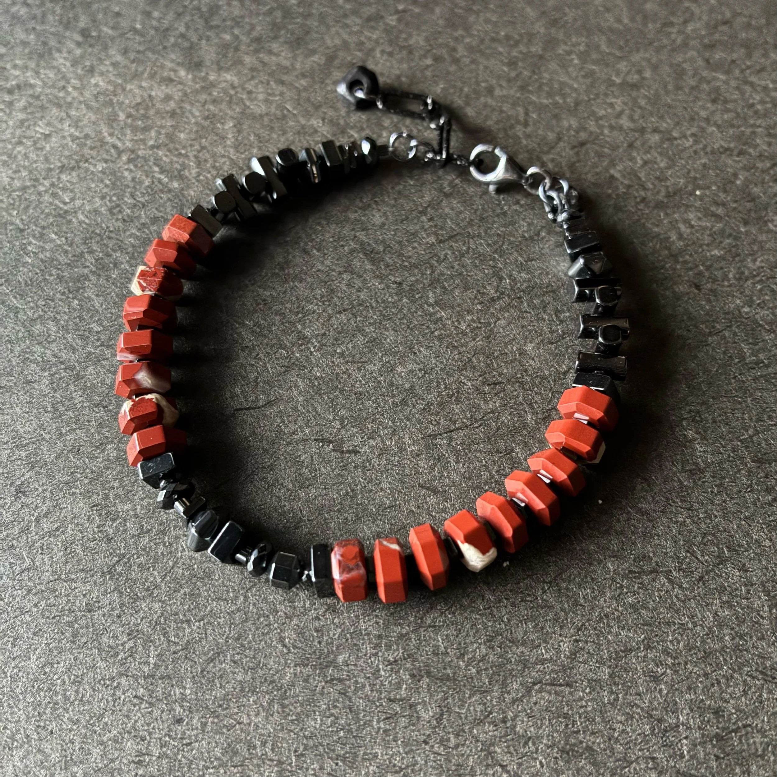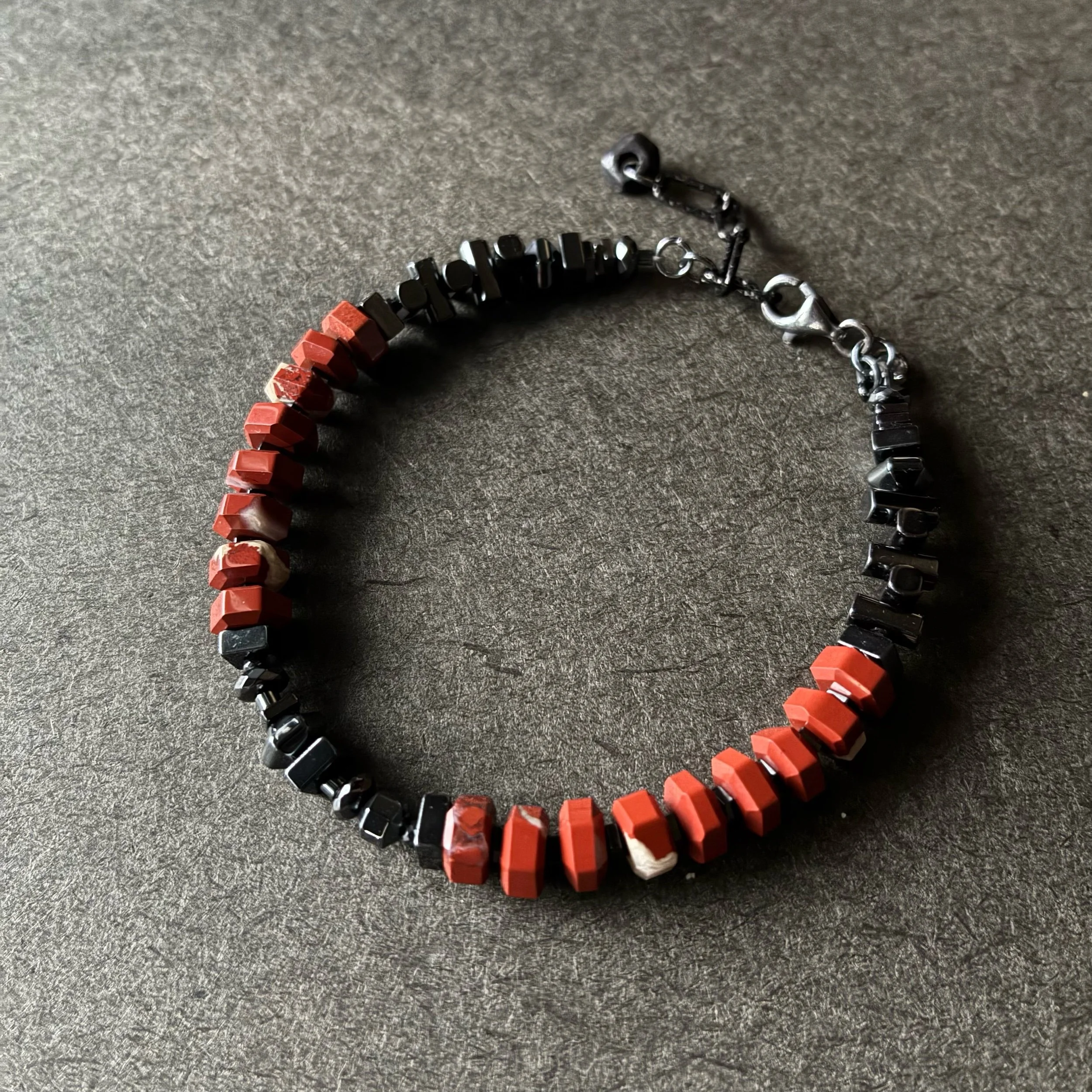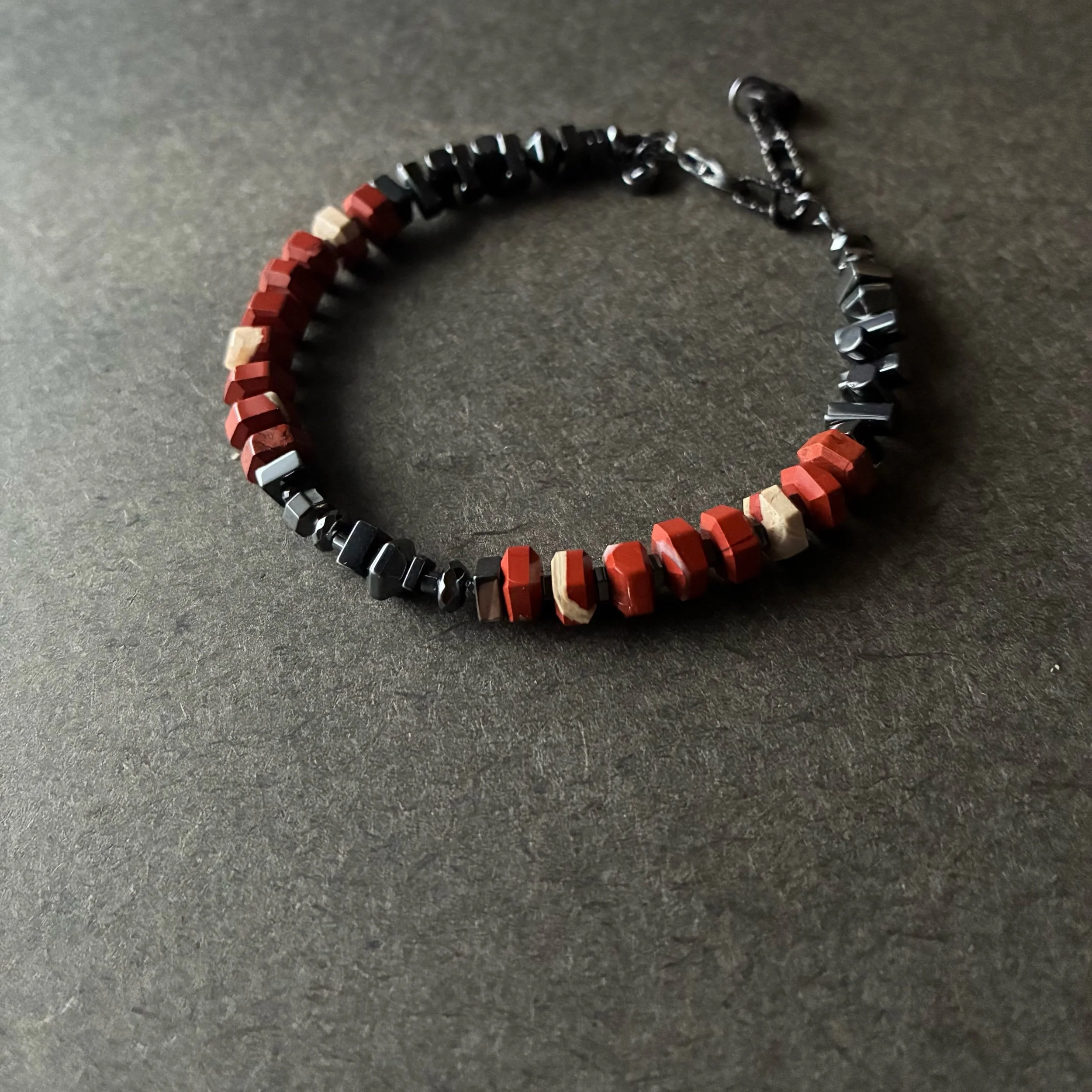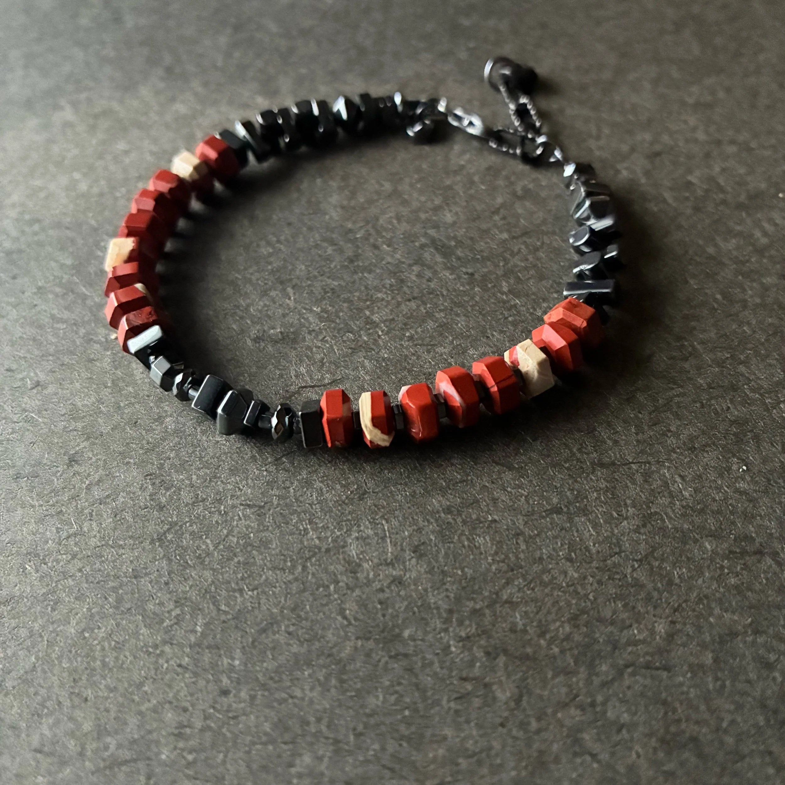 This bracelet is made of hexagon shaped faceted Red Brecciated Jasper ( AAA ) and various shapes of Hematite